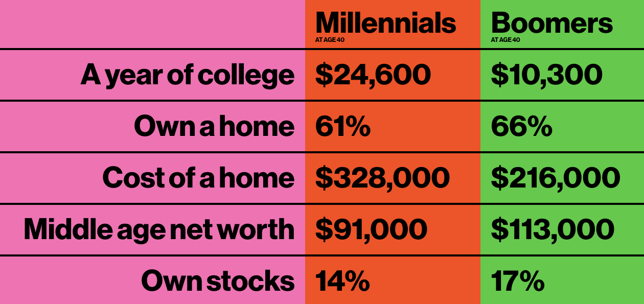 If you are between the ages of 25 - 40 years old (millennial generation), you are, in every way measurable, financially worse off than your parents. You have less wealth, more debt, and about the same earnings as the past generation (inflation-adjusted data from the Federal Reserve).