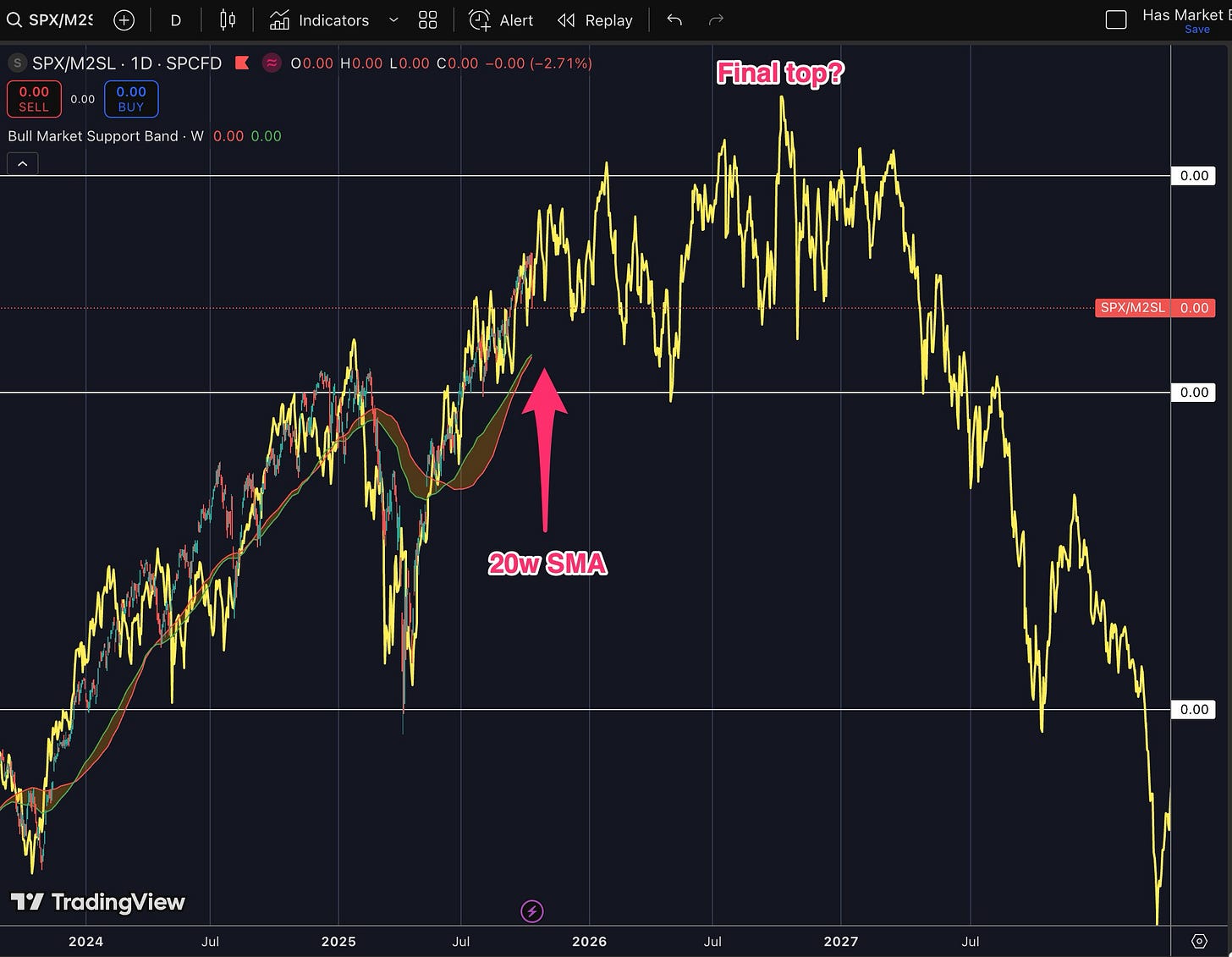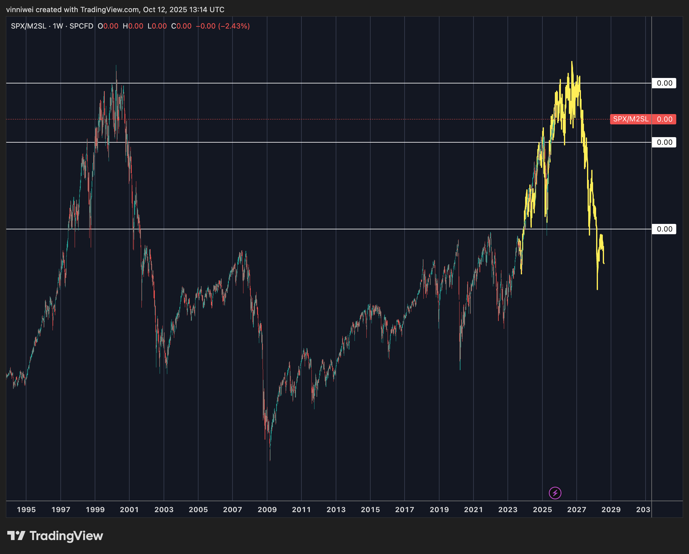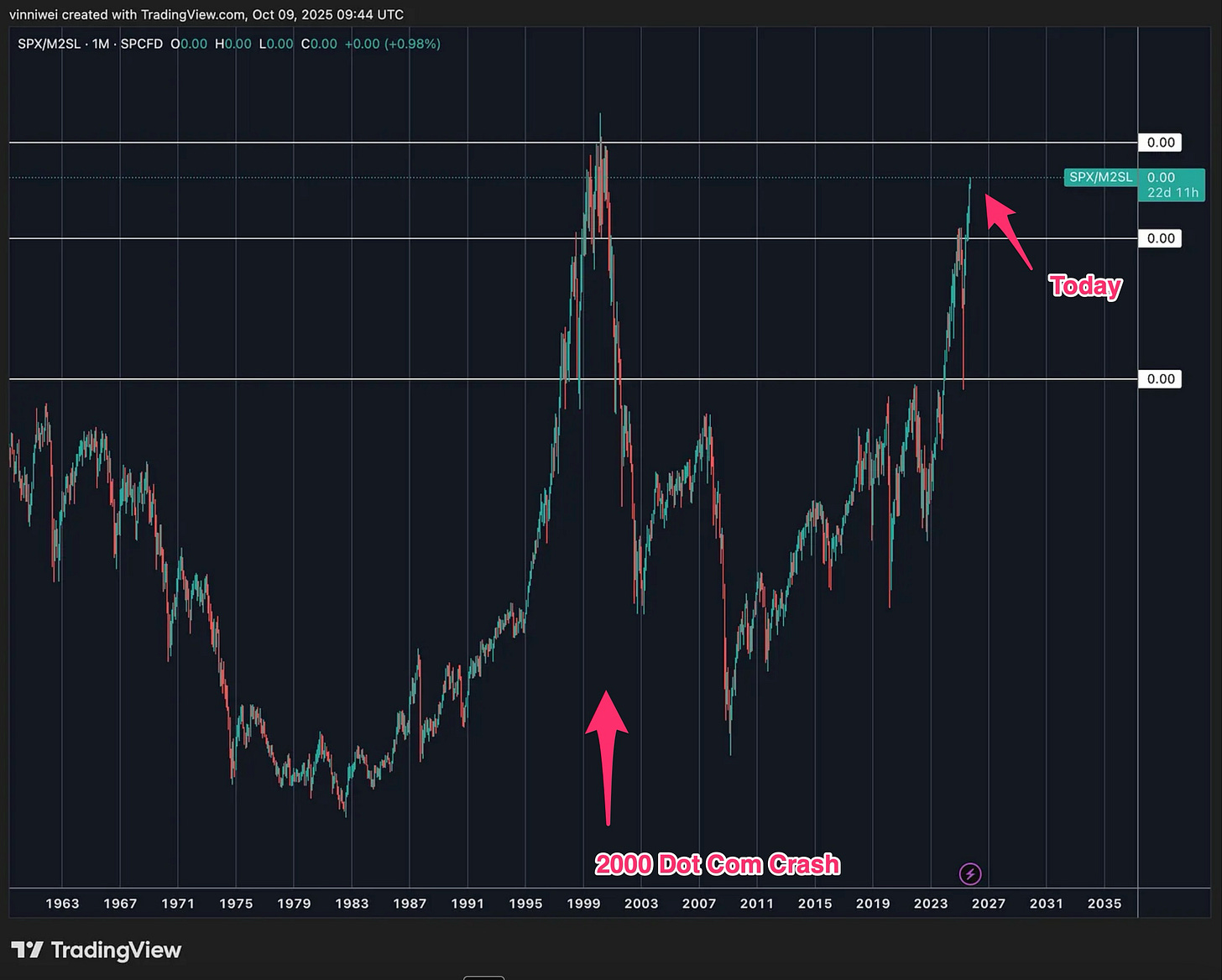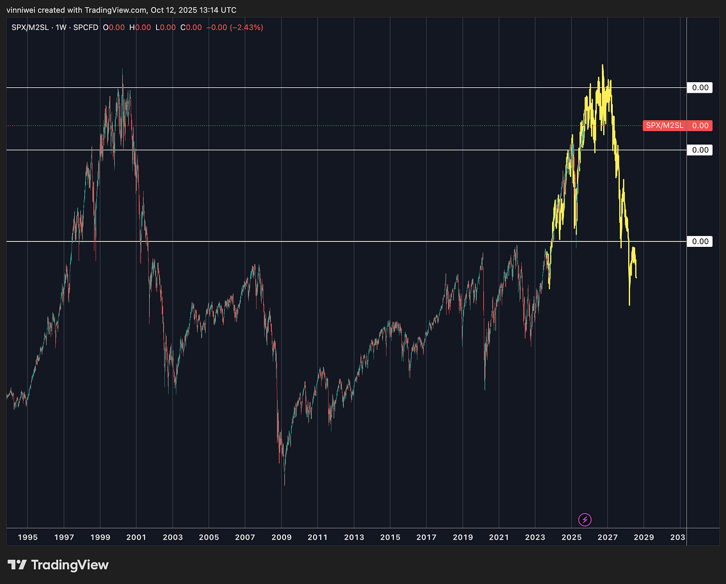 This time is different(?): The S&P 500 in 2000 had Pets.com burning cash. Today? NVIDIA does $131B revenue with 50% profit margins. Amazon does $638B in revenue—more than Microsoft’s entire 2000 market cap. These aren’t vaporware companies—they’re printing money. It’s probable to say that the S&P today is made up of better companies that increase productivity and efficiency more than those in the past. Leveraging new technology, AI, and talent, it is also possible to expect SPX/M2 to break higher this time.