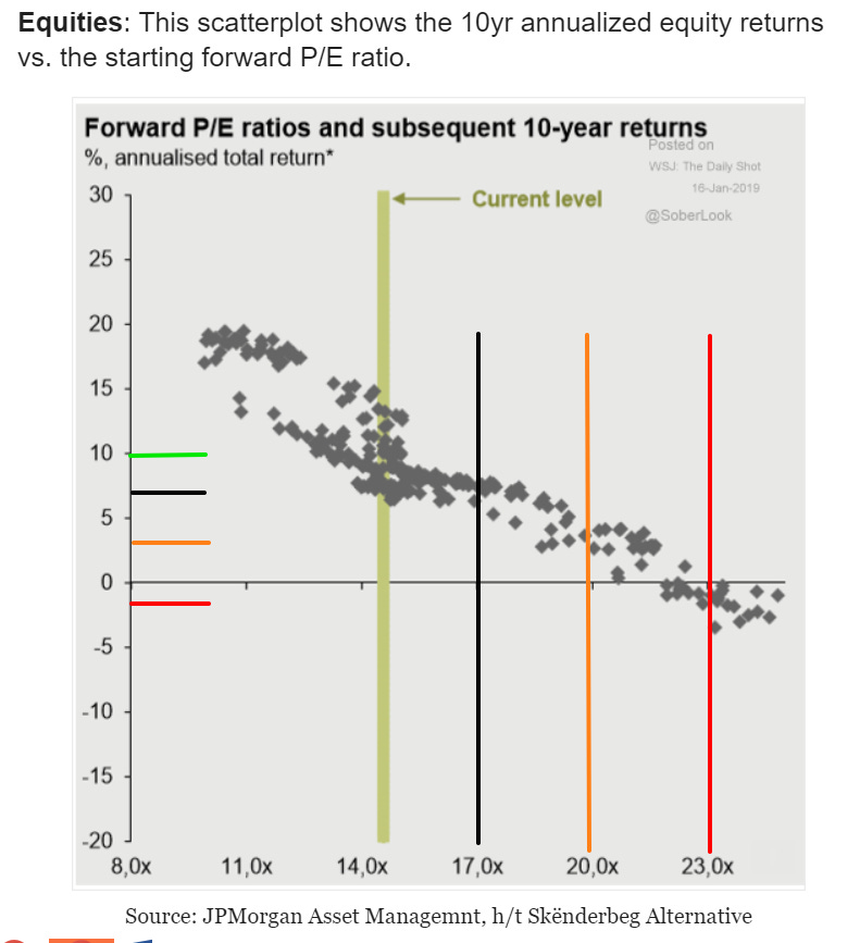 P/E was high (right side), returns dropped to 0-5% annually, or worse.
