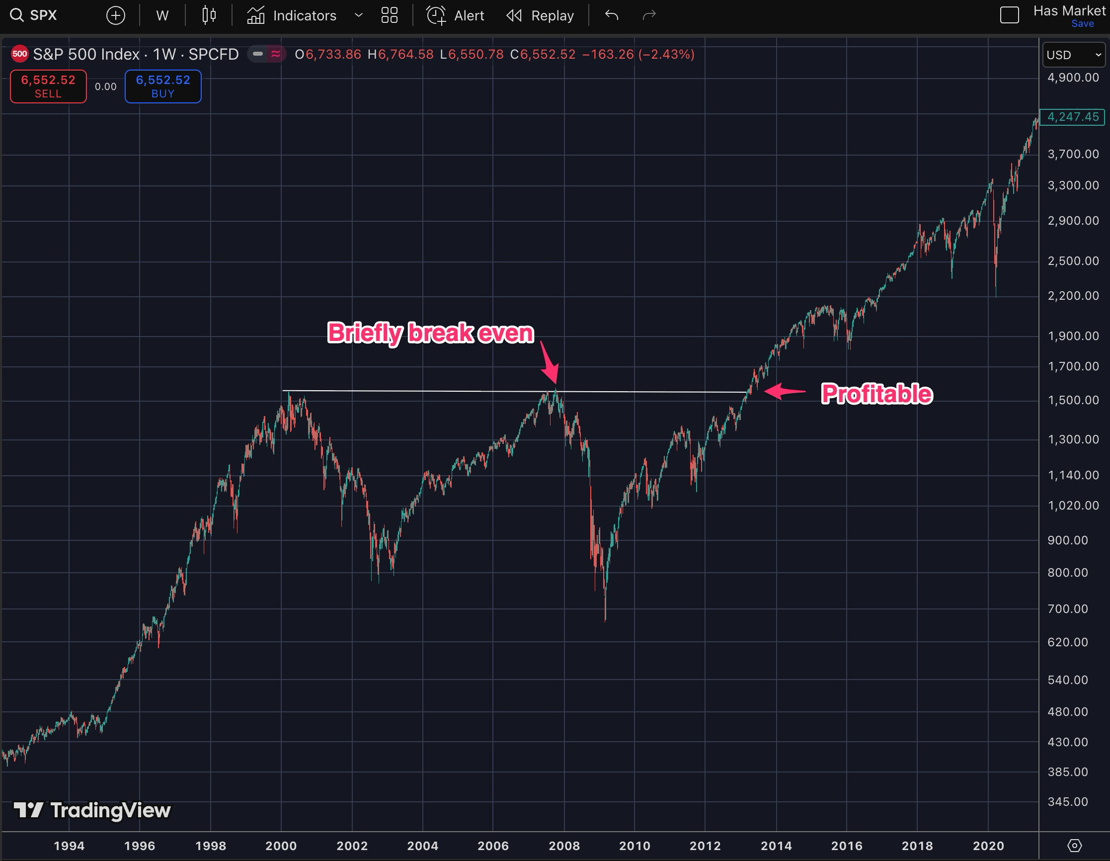 Modelling this back to the Dot Com Crash, you can see that if you’ve bought at similar levels to now, it would take you 7 years of watching your portfolio bleed to briefly break even (before experiencing the 2008 crash).