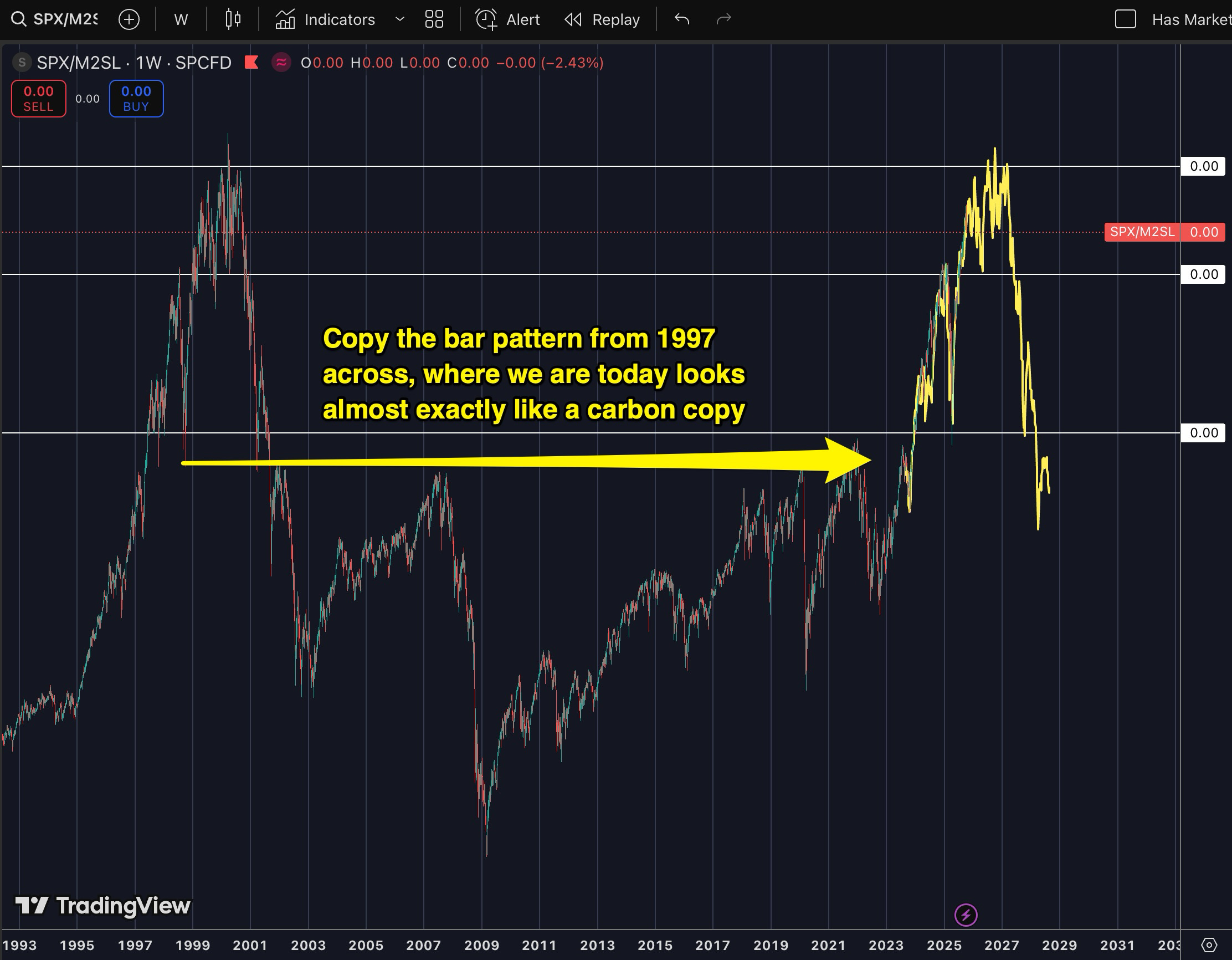 History repeats: If we follow the Dot Com pattern starting from 1997, we’d see that where we are today looks almost like a carbon copy. If the pattern continues to rhyme, a likely scenario is that we will see some correction between July 2026 and early 2027.