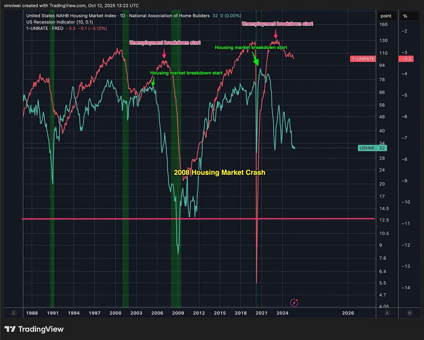 Quick refresher from last time: Housing cracks first when the economy weakens—it’s extremely sensitive to interest rates. Builders are forward-looking: they commit big money months ahead, so they pull back early when they see trouble. Historically, when builder confidence drops sharply, unemployment jumps about a year later.